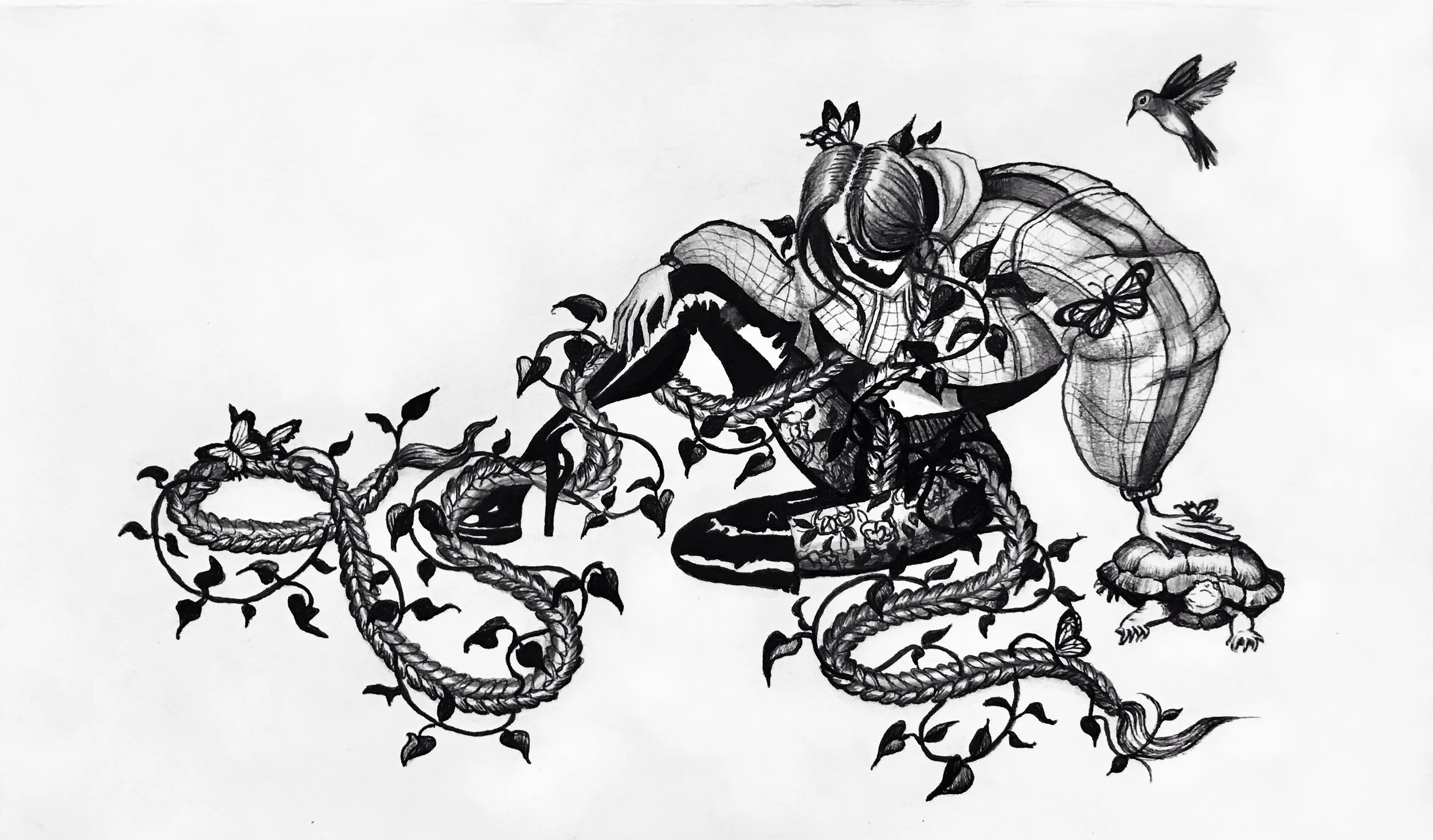 The flower wreath, Vinok, is an ancient symbol in Ukrainian culture. Each herb, colorful ribbon, and hand-picked flower, is intricately woven into each woman’s wreath with magic according to the seasons and reflects the events in her life. This ornamental tradition dating back centuries, has historically guarded bodies from evil energies. The figure in my series leans into the cyclical themes of the four seasons, either braiding her hair or covering in accordance to each phase.