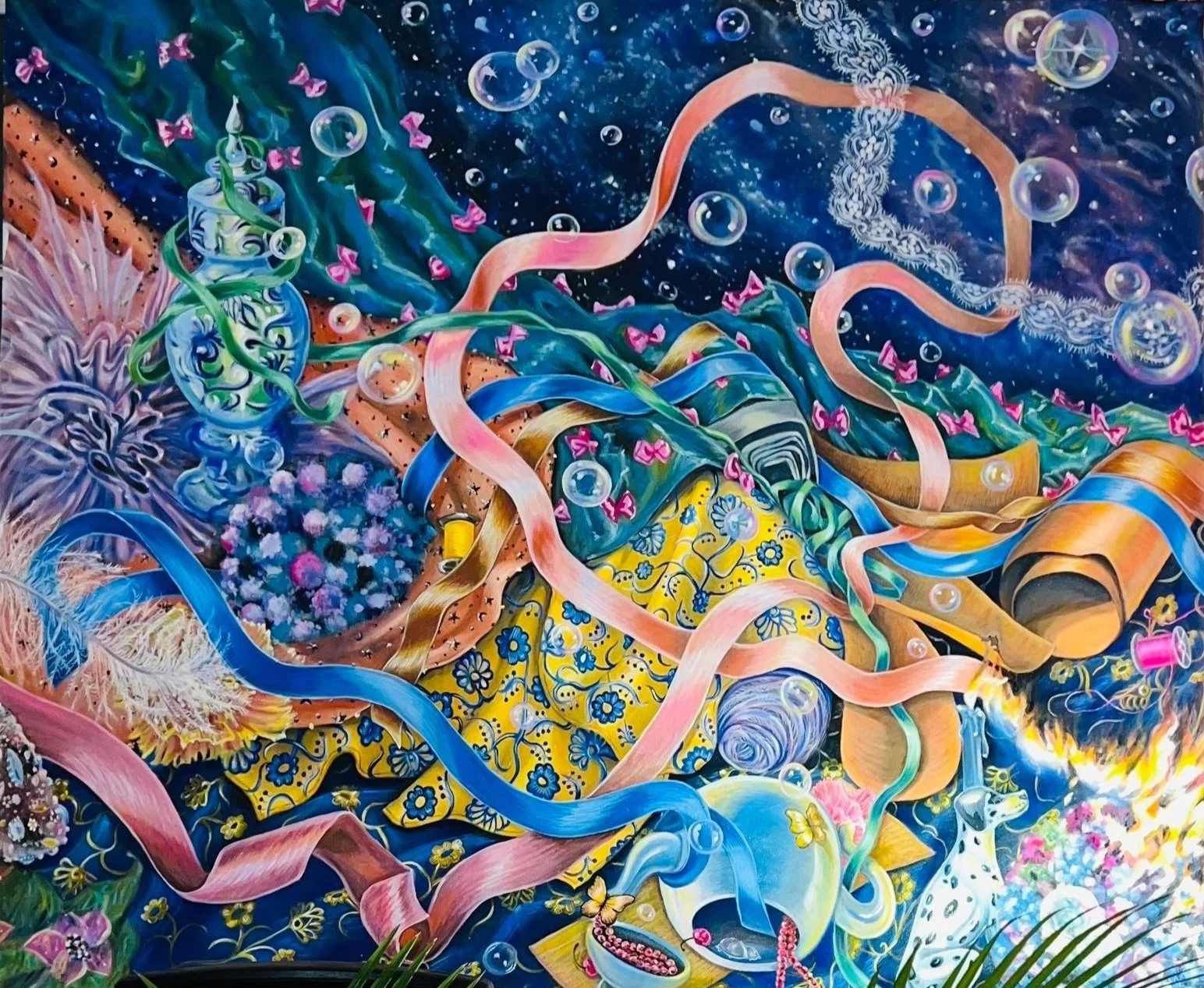 Is the second painting in the unfolding triptych series of oil paintings Nadia has been creating since April of 2023. This body of work explores the ways in which fabric and fashion hold stories, preserve culture, and curate memory.