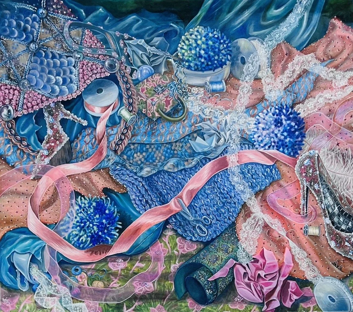 Is the first piece in an unfolding series of 6ft x 7ft oil paintings on canvas. Fabric plays an integral role in Nadia’s life. The clothing she collects and wears daily reminds her of special places, wisdoms, and cultural traditions passed down to her through her Ukrainian heritage.